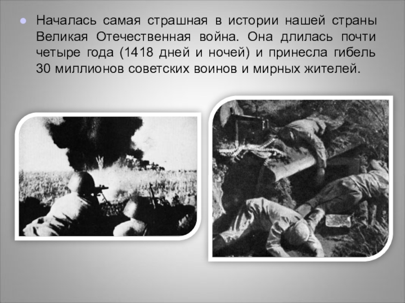 длилась почти четыре года (1418 дней и ночей) и принесла гибель 30 миллионов советских воинов и мирных жителей.