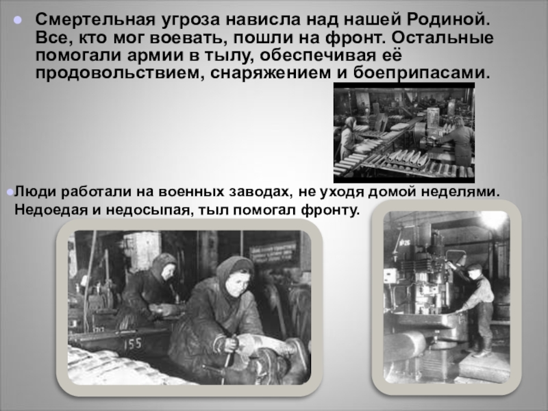 Слайд 5Смертельная угроза нависла над нашей Родиной. Все, кто мог воевать, пошли