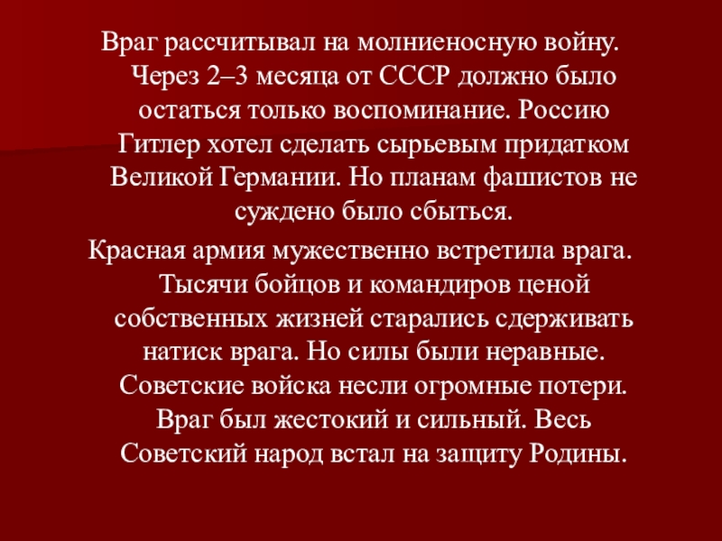 Слайд 5Враг рассчитывал на молниеносную войну. Через 2–3 месяца от СССР должно