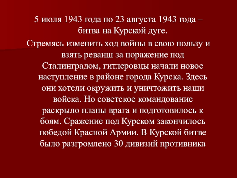 Стремясь изменить ход войны в свою пользу и взять реванш за поражение под Сталинградом, гитлеровцы начали новое наступление в районе города Курска. Здесь они хотели окружить и уничтожить наши войска. Но советское командование раскрыло планы врага и подготовилось к боям. Сражение под Курском закончилось победой Красной Армии. В Курской битве было разгромлено 30 дивизий противника