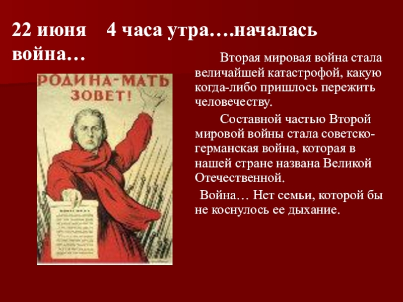 Красная армия мужественно встретила врага. Тысячи бойцов и командиров ценой собственных жизней старались сдерживать натиск врага. Но силы были неравные. Советские войска несли огромные потери. Враг был жестокий и сильный. Весь Советский народ встал на защиту Родины.