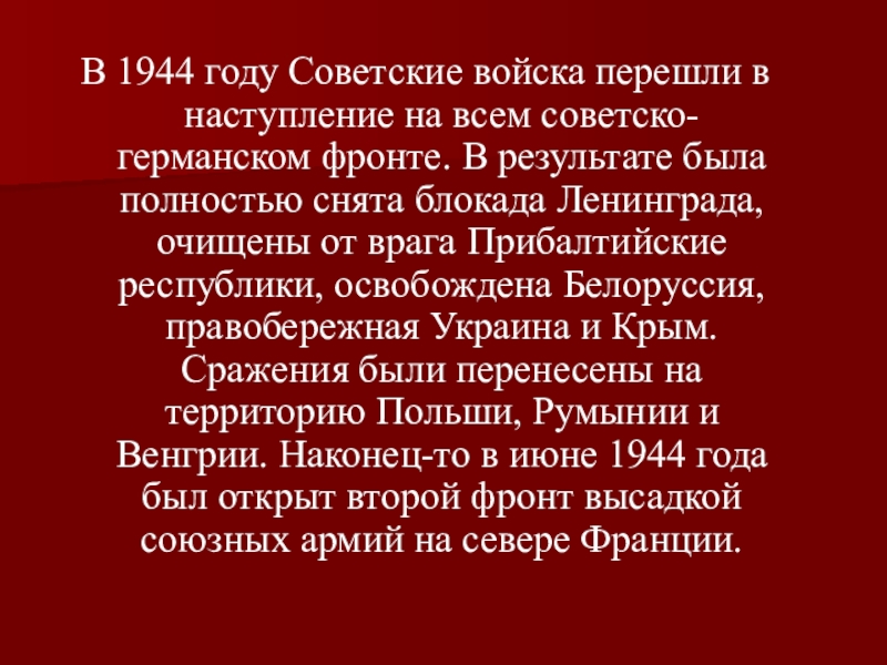 фронте. В результате была полностью снята блокада Ленинграда, очищены от врага Прибалтийские республики, освобождена Белоруссия, правобережная Украина и Крым. Сражения были перенесены на территорию Польши, Румынии и Венгрии. Наконец-то в июне 1944 года был открыт второй фронт высадкой союзных армий на севере Франции.