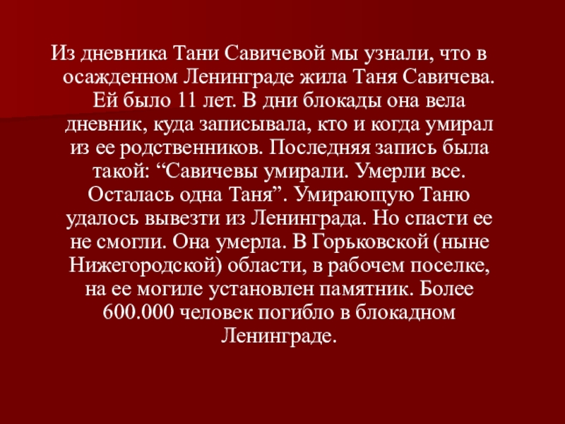 Таня Савичева. Ей было 11 лет. В дни блокады она вела дневник, куда записывала, кто и когда умирал из ее родственников. Последняя запись была такой: “Савичевы умирали. Умерли все. Осталась одна Таня”. Умирающую Таню удалось вывезти из Ленинграда. Но спасти ее не смогли. Она умерла. В Горьковской (ныне Нижегородской) области, в рабочем поселке, на ее могиле установлен памятник. Более 600.000 человек погибло в блокадном Ленинграде.
