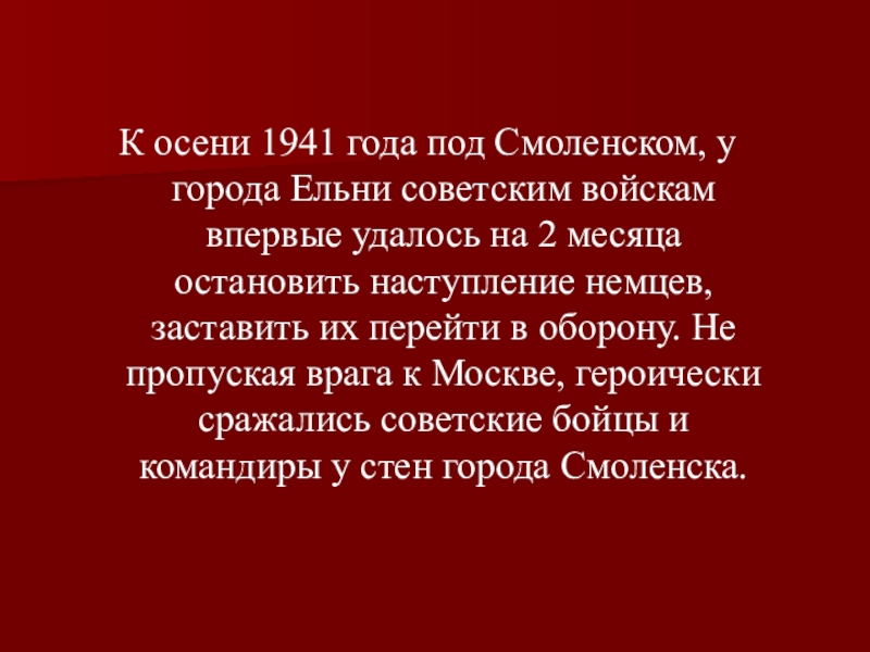 впервые удалось на 2 месяца остановить наступление немцев, заставить их перейти в оборону. Не пропуская врага к Москве, героически сражались советские бойцы и командиры у стен города Смоленска.