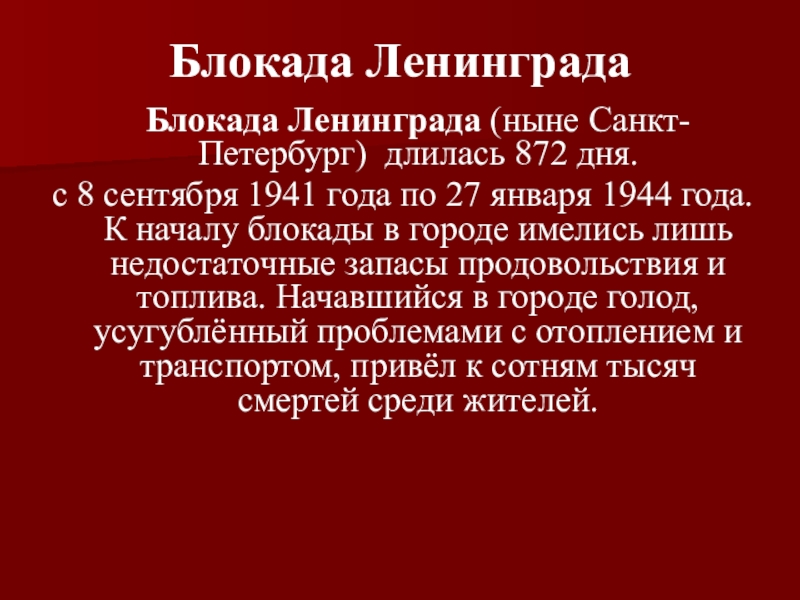 Блокада Ленинграда (ныне Санкт-Петербург) длилась 872 дня.