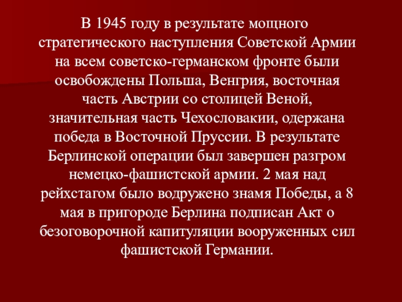 на всем советско-германском фронте были освобождены Польша, Венгрия, восточная часть Австрии со столицей Веной, значительная часть Чехословакии, одержана победа в Восточной Пруссии. В результате Берлинской операции был завершен разгром немецко-фашистской армии. 2 мая над рейхстагом было водружено знамя Победы, а 8 мая в пригороде Берлина подписан Акт о безоговорочной капитуляции вооруженных сил фашистской Германии.