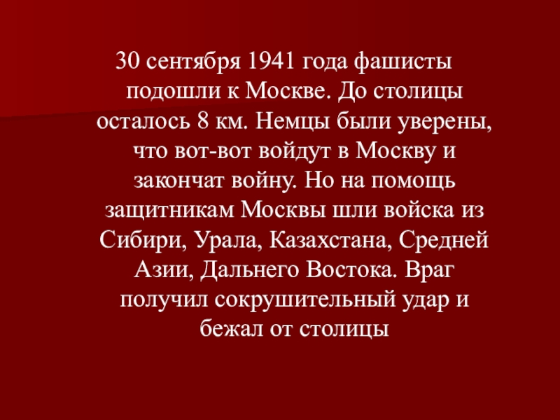 8 км. Немцы были уверены, что вот-вот войдут в Москву и закончат войну. Но на помощь защитникам Москвы шли войска из Сибири, Урала, Казахстана, Средней Азии, Дальнего Востока. Враг получил сокрушительный удар и бежал от столицы