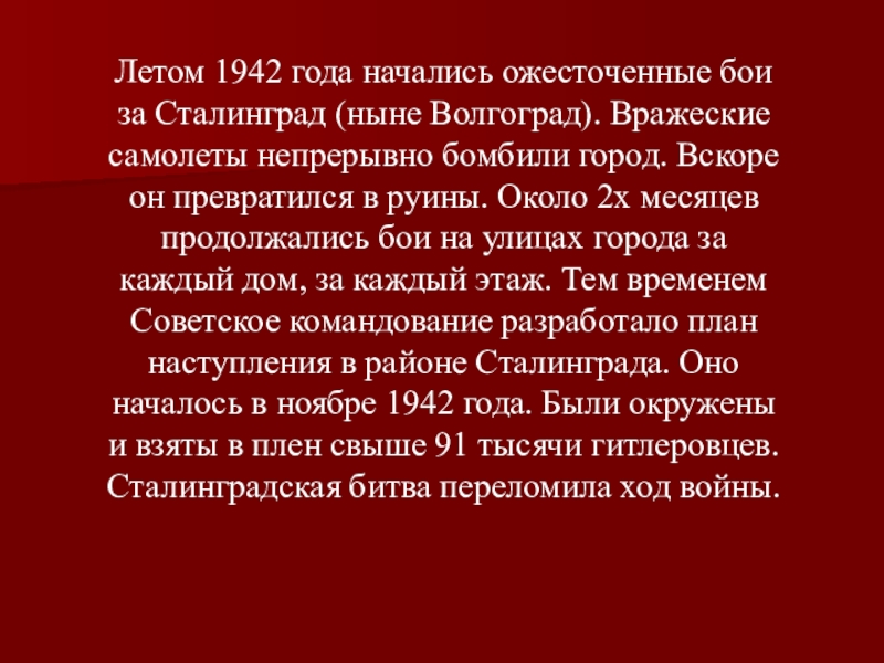 Волгоград). Вражеские самолеты непрерывно бомбили город. Вскоре он превратился в руины. Около 2х месяцев продолжались бои на улицах города за каждый дом, за каждый этаж. Тем временем Советское командование разработало план наступления в районе Сталинграда. Оно началось в ноябре 1942 года. Были окружены и взяты в плен свыше 91 тысячи гитлеровцев. Сталинградская битва переломила ход войны.