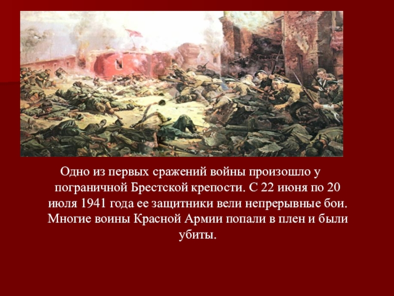 пограничной Брестской крепости. С 22 июня по 20 июля 1941 года ее защитники вели непрерывные бои. Многие воины Красной Армии попали в плен и были убиты.
