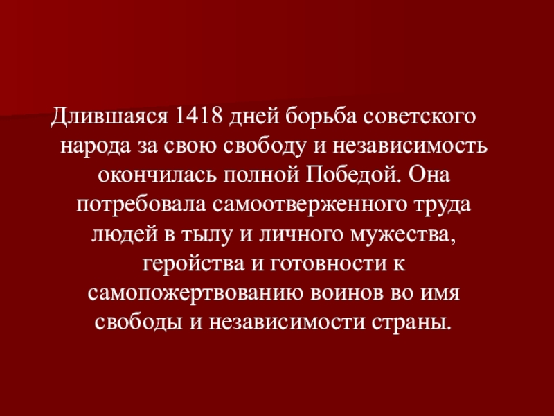 Слайд 25Длившаяся 1418 дней борьба советского народа за свою свободу и независимость