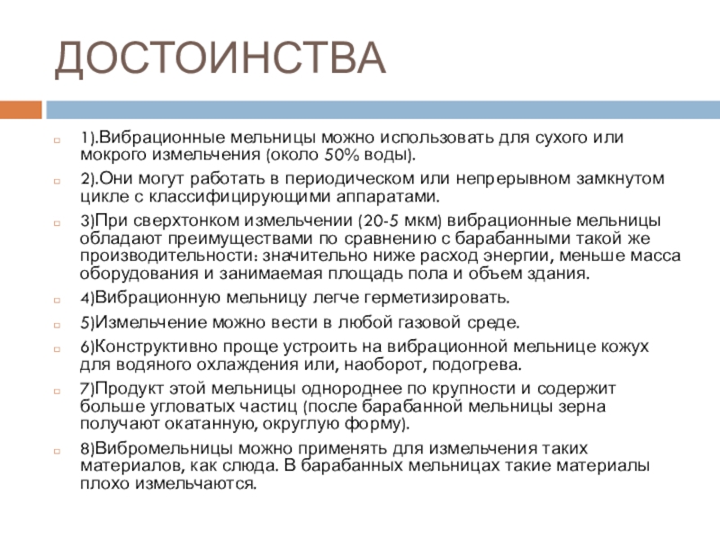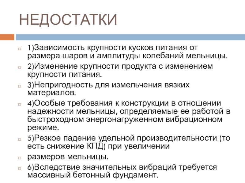 НЕДОСТАТКИ1)Зависимость крупности кусков питания от размера шаров и амплитуды колебаний мельницы. 2)Изменение крупности продукта с изменением крупности