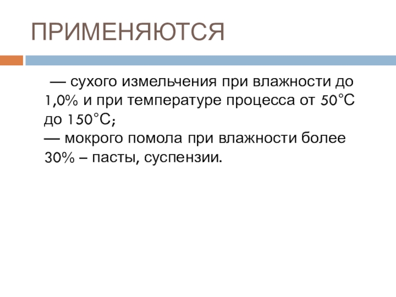 ПРИМЕНЯЮТСЯ	— сухого измельчения при влажности до 1,0% и при температуре процесса от 50°С до 150°С; — мокрого