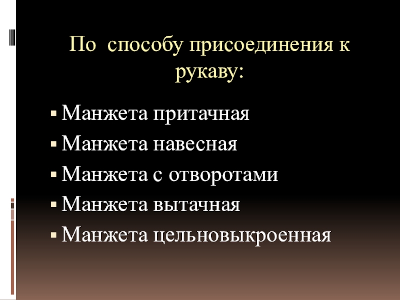 По способу присоединения к рукаву:Манжета притачнаяМанжета навесная Манжета с отворотамиМанжета вытачнаяМанжета цельновыкроенная