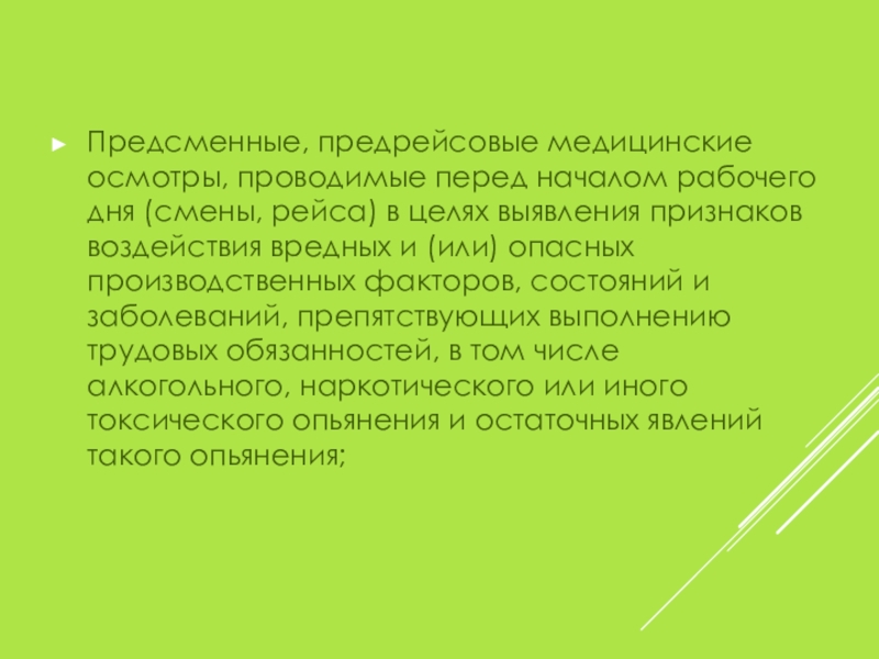 дня (смены, рейса) в целях выявления признаков воздействия вредных и (или) опасных производственных факторов рабочей среды и трудового процесса на состояние здоровья работников, острого профессионального заболевания или отравления, признаков алкогольного, наркотического или иного токсического опьянения.