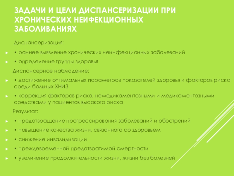 Слайд 14ЗАДАЧИ И ЦЕЛИ ДИСПАНСЕРИЗАЦИИ ПРИ ХРОНИЧЕСКИХ НЕИФЕКЦИОННЫХ ЗАБОЛИВАНИЯХ