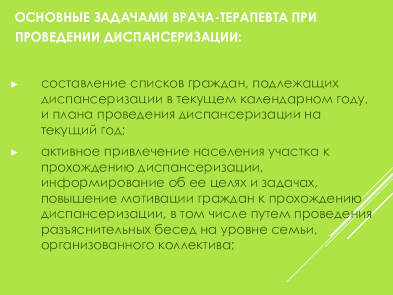 Слайд 9ОСНОВНЫЕ ЗАДАЧАМИ ВРАЧА-ТЕРАПЕВТА ПРИ ПРОВЕДЕНИИ ДИСПАНСЕРИЗАЦИИ: