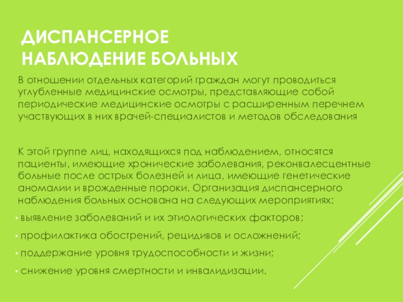 Слайд 7ДИСПАНСЕРНОЕ НАБЛЮДЕНИЕ БОЛЬНЫХ