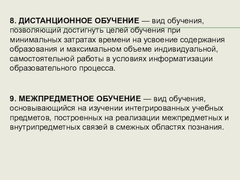 9. МЕЖПРЕДМЕТНОЕ ОБУЧЕНИЕ — вид обучения, основывающийся на изучении интегрированных учебных предметов, построенных на реализации межпредметных и внутрипредметных связей в смежных областях познания.