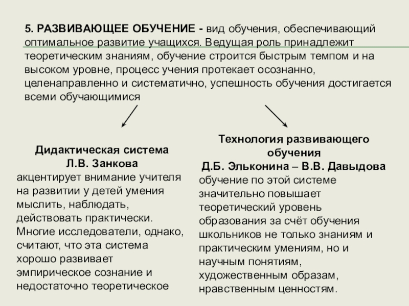 акцентирует внимание учителя на развитии у детей умения мыслить, наблюдать, действовать практически. Многие исследователи, однако, считают, что эта система хорошо развивает эмпирическое сознание и недостаточно теоретическое