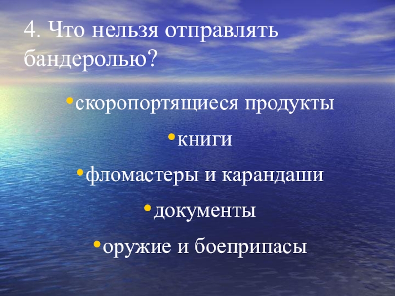 4. Что нельзя отправлять бандеролью?скоропортящиеся продуктыкнигифломастеры и карандашидокументыоружие и боеприпасы