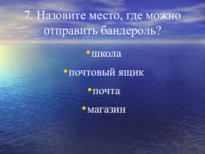 7. Назовите место, где можно отправить бандероль?школапочтовый ящикпочтамагазин
