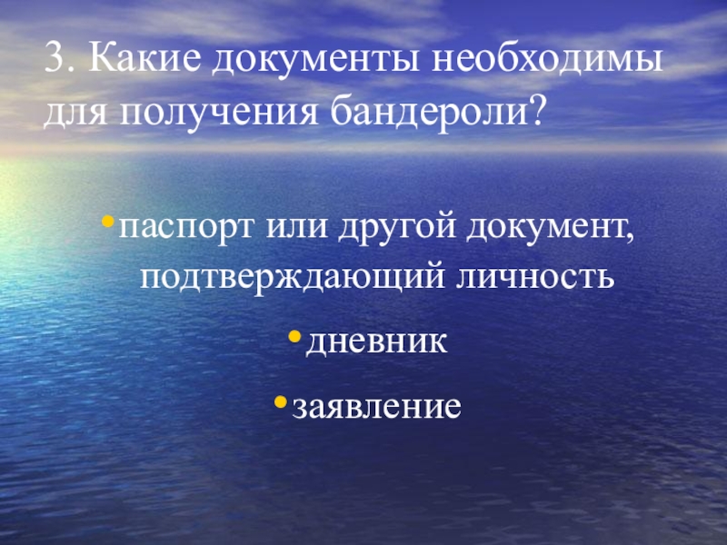 3. Какие документы необходимы для получения бандероли?паспорт или другой документ, подтверждающий личностьдневникзаявление
