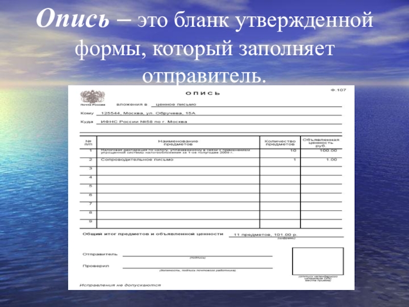 Слайд 15Опись – это бланк утвержденной формы, который заполняет отправитель.