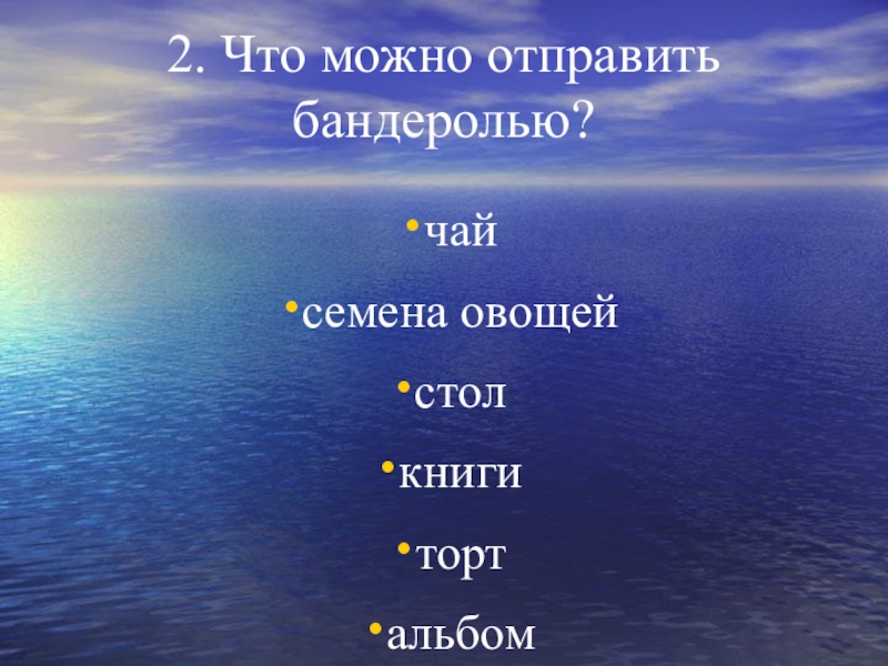 2. Что можно отправить бандеролью?чайсемена овощейстолкнигитортальбом