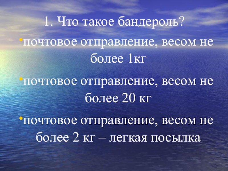 1. Что такое бандероль?почтовое отправление, весом не более 1кгпочтовое отправление, весом не более 20 кгпочтовое отправление, весом