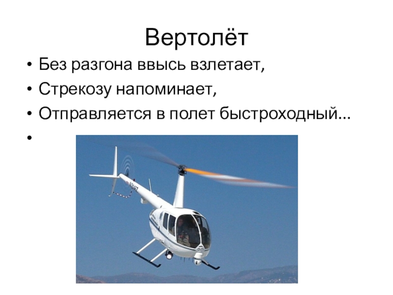 Вертолёт Без разгона ввысь взлетает,Стрекозу напоминает,Отправляется в полет быстроходный...