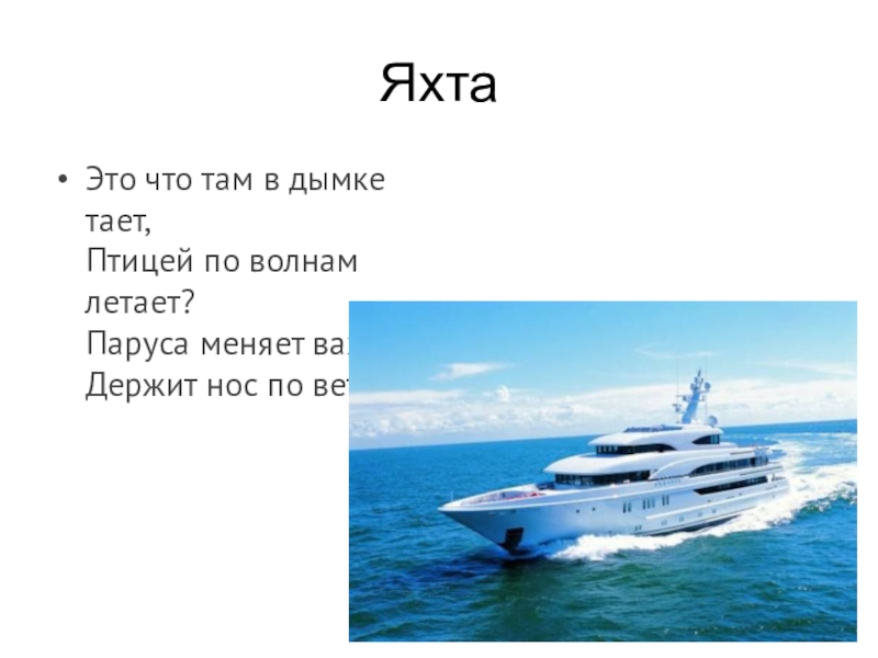 Яхта Это что там в дымке тает, Птицей по волнам летает? Паруса меняет вахта, Держит нос по