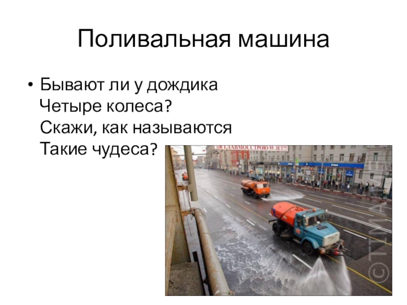 Поливальная машинаБывают ли у дождика Четыре колеса? Скажи, как называются Такие чудеса?