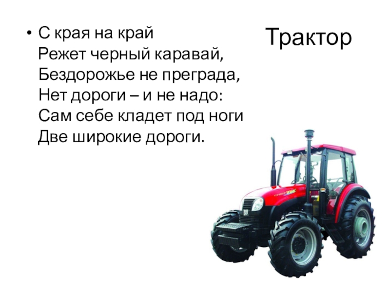 Трактор С края на край Режет черный каравай, Бездорожье не преграда, Нет дороги – и не надо:
