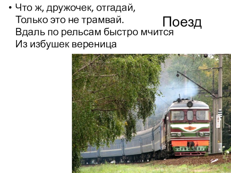 Поезд Что ж, дружочек, отгадай, Только это не трамвай. Вдаль по рельсам быстро мчится Из избушек вереница