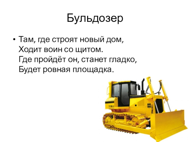 Бульдозер Там, где строят новый дом, Ходит воин со щитом. Где пройдёт он, станет гладко, Будет ровная