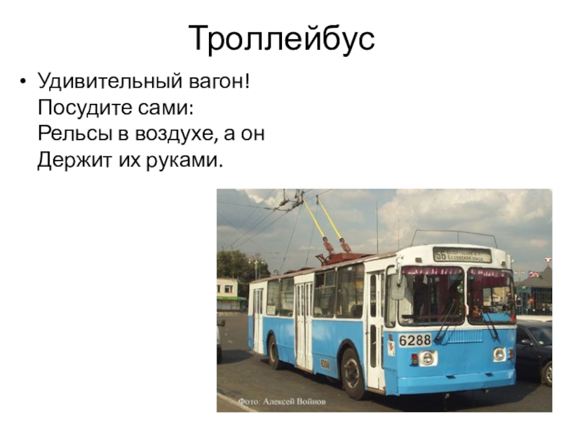 Троллейбус Удивительный вагон! Посудите сами: Рельсы в воздухе, а он Держит их руками.
