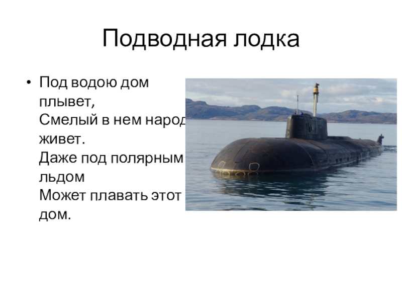 Подводная лодка Под водою дом плывет, Смелый в нем народ живет. Даже под полярным льдом Может плавать