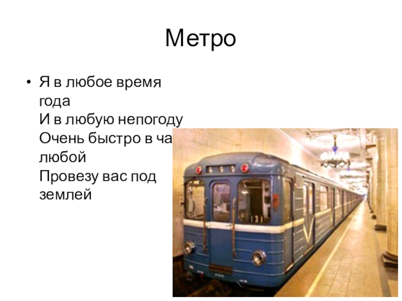Метро Я в любое время года И в любую непогоду Очень быстро в час любой Провезу вас