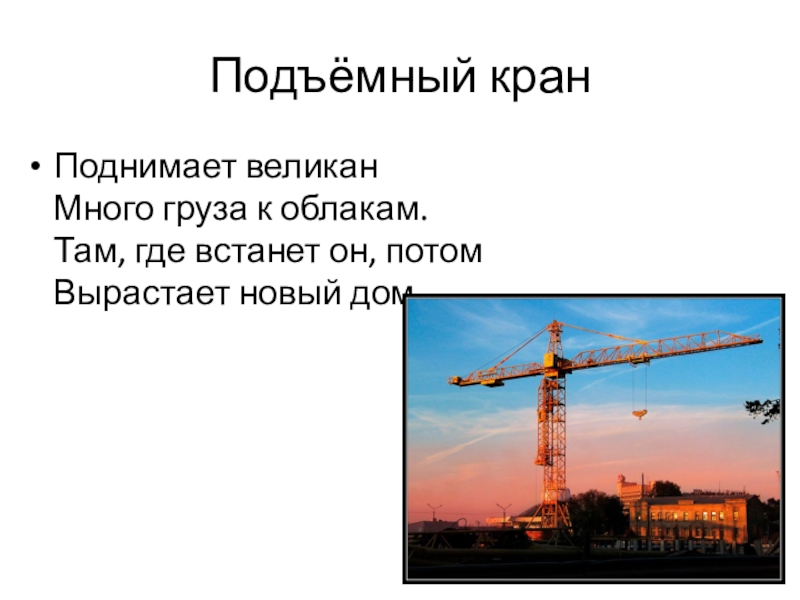 Подъёмный кранПоднимает великан Много груза к облакам. Там, где встанет он, потом Вырастает новый дом.
