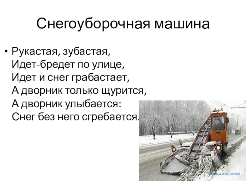 Снегоуборочная машинаРукастая, зубастая, Идет-бредет по улице, Идет и снег грабастает, А дворник только щурится, А дворник улыбается: