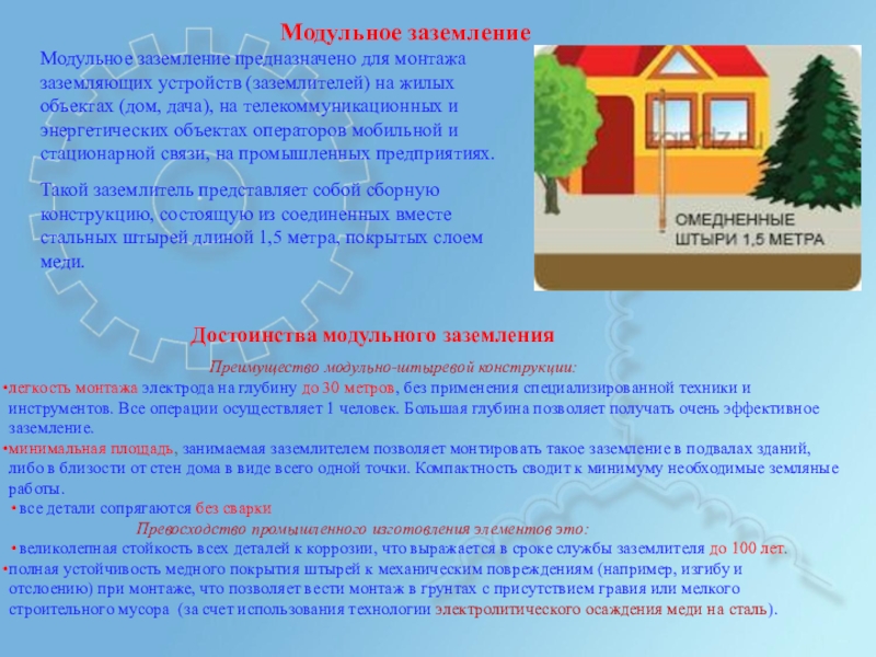 полная устойчивость медного покрытия штырей к механическим повреждениям (например, изгибу и отслоению) при монтаже, что позволяет вести монтаж в грунтах с присутствием гравия или мелкого строительного мусора (за счет использования технологии электролитического осаждения меди на сталь).