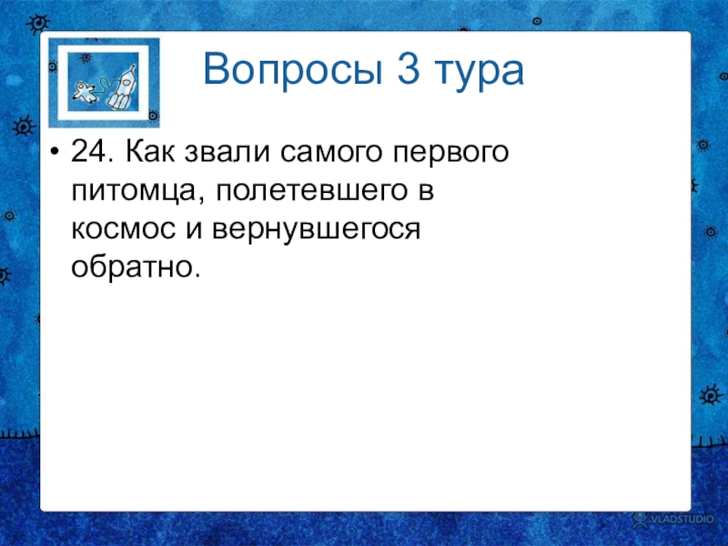 Вопросы 3 тура24. Как звали самого первого питомца, полетевшего в космос и вернувшегося обратно.