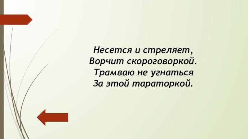 Несется и стреляет, Ворчит скороговоркой.Трамваю не угнаться За этой тараторкой.