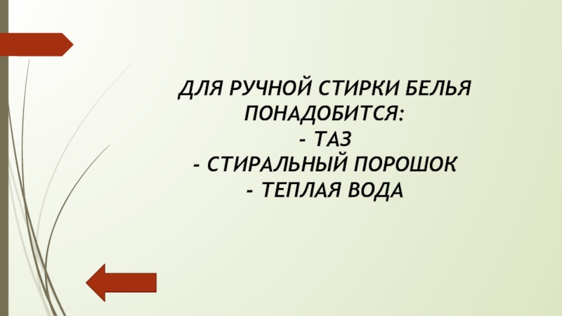 Слайд 17ДЛЯ РУЧНОЙ СТИРКИ БЕЛЬЯ ПОНАДОБИТСЯ: - ТАЗ - СТИРАЛЬНЫЙ ПОРОШОК - ТЕПЛАЯ ВОДА