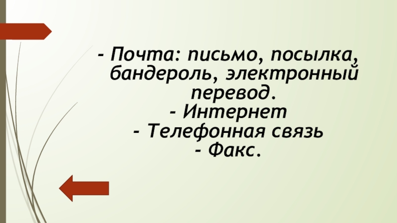 Слайд 45- Почта: письмо, посылка, бандероль, электронный перевод.