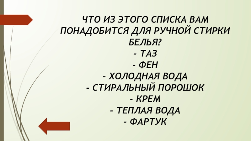 Слайд 16ЧТО ИЗ ЭТОГО СПИСКА ВАМ ПОНАДОБИТСЯ ДЛЯ РУЧНОЙ СТИРКИ БЕЛЬЯ? - ТАЗ -