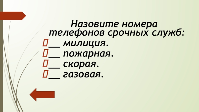Назовите номера телефонов срочных служб:__ милиция.__ пожарная.__ скорая.__ газовая.