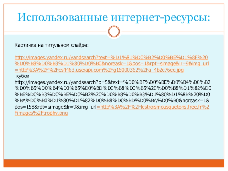 Использованные интернет-ресурсы:Картинка на титульном слайде: http://images.yandex.ru/yandsearch?text=%D1%81%D0%B2%D0%BE%D1%8F%20%D0%B8%D0%B3%D1%80%D0%B0&noreask=1&pos=1&rpt=simage&lr=9&img_url=http%3A%2F%2Fcs4463.userapi.com%2Fg16000362%2Fa_4b2c76ec.jpg  кубок: http://images.yandex.ru/yandsearch?p=5&text=%D0%BF%D0%BE%D0%B4%D0%B2%D0%B5%D0%B4%D0%B5%D0%BD%D0%B8%D0%B5%20%D0%B8%D1%82%D0%BE%D0%B3%D0%BE%D0%B2%20%D0%B8%D0%B3%D1%80%D1%8B%20%D0%BA%D0%B0%D1%80%D1%82%D0%B8%D0%BD%D0%BA%D0%B0&noreask=1&pos=158&rpt=simage&lr=9&img_url=http%3A%2F%2Flestroismousquetons.free.fr%2Fimages%2Ftrophy.png