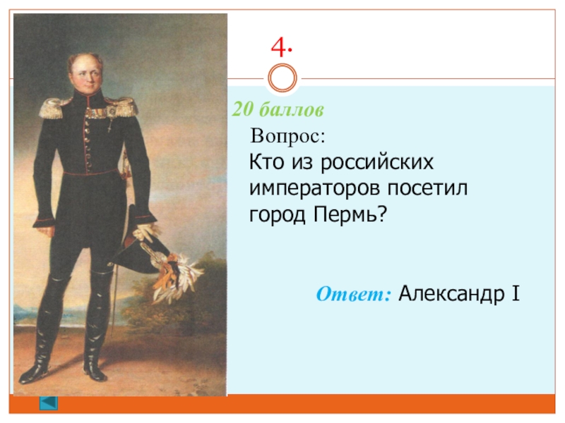 4.  10 баллов. Вопрос: Назовите города, бывшие столицами Пермского краяОтвет: Чердынь, Соликамск, Кунгур, Пермь