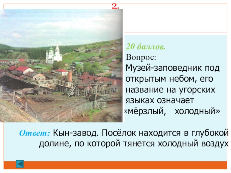 2.  50 баллов. Вопрос: Своё название город получил от двух коми-пермяцких слов, одно из которых означает